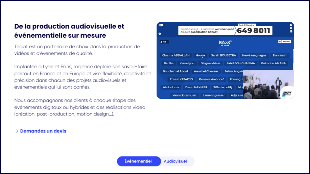 Chez Teazit, agence de production audiovisuelle, nous accompagnons nos clients dans l’élaboration de leur stratégie de contenus vidéo, de la conception à la réalisation en passant par les conseils en diffusion et en SEO vidéo.